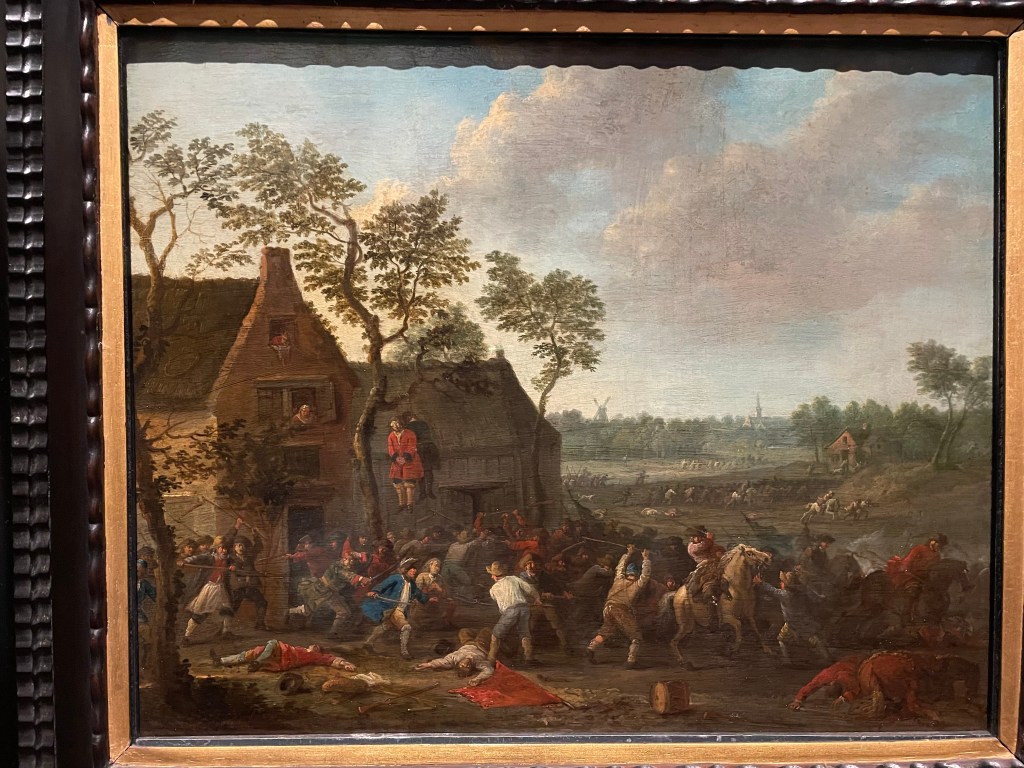 The painting that grabbed my attention and reminded me of Robert is The Robbery of the Farm by Karel Breydel. What made me look more closely here is the two figures, bound, hanging from the tree and the women looking out from the upper story windows. Violence between soldiers armed with swords and civilians armed with sticks swirls in the foreground, sweeping into the mid-and background.+