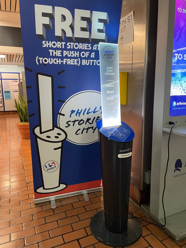 So, we’re sitting in the waiting area at the Jefferson SEPTA* station with half an hour to wade through before our train home. Despite the upgrades, it’s still kind of depressing; I think it’s because of the lighting. There’s always some form of people-watching entertainment, but that pales fairly quickly. Waiting for the train to arrive, time feels flexible; it drags along then suddenly rushes with accompanying anxiety as the train approaches. As I looked around the waiting area on the upper level (there are two levels–track level and the waiting area above it), I noticed what seemed to be an anomaly next to the pillar flashing advertisements about Jefferson hospital. On closer inspection I saw that it was this short story dispenser.