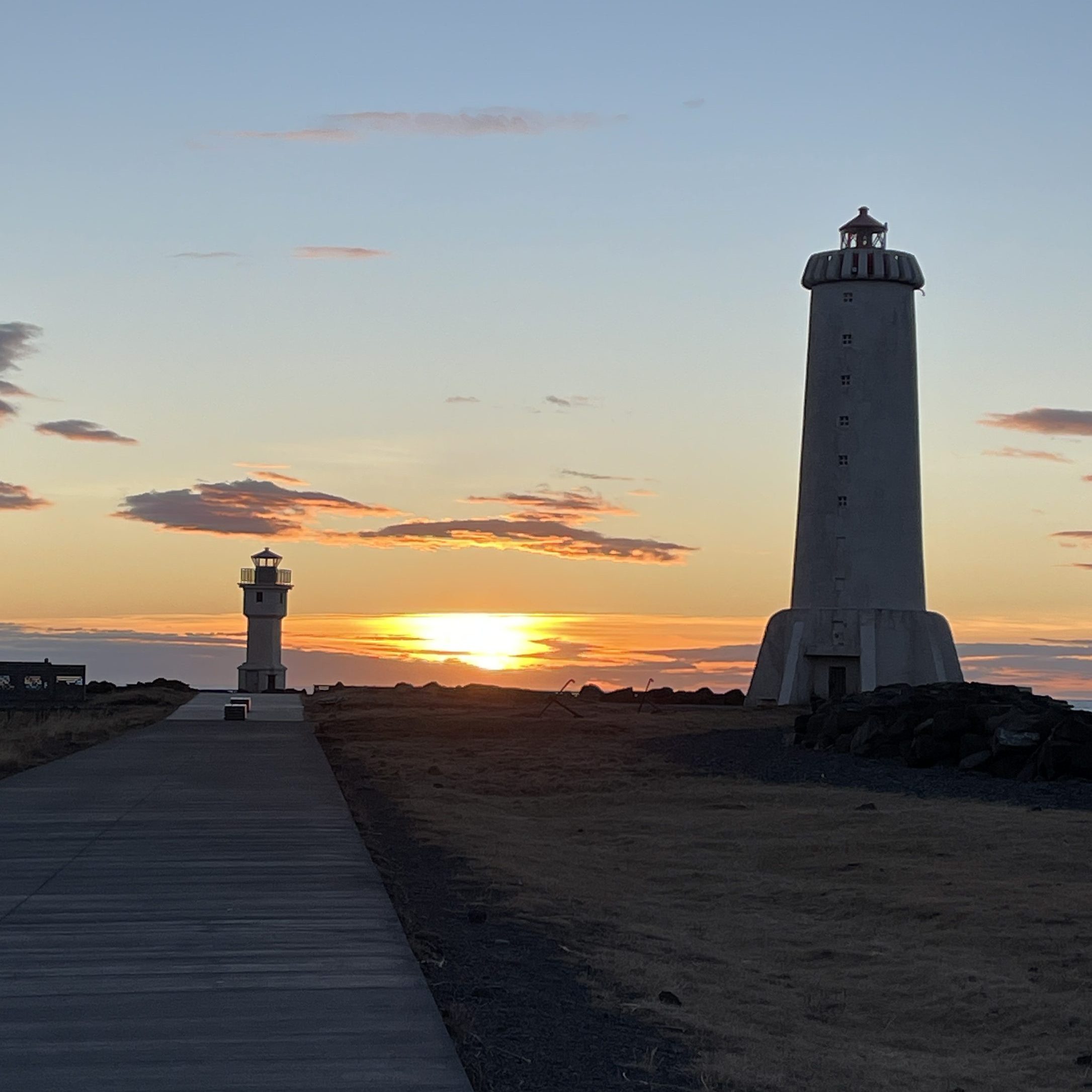 Eva Bjorg has a series of novels–Forbidden Iceland–that are set in the small town of Akranes on the tip of a peninsula across Hvalfjord (Whale Fjord) from Reykjavik. Our daughter drove us out to the town so I could have a concrete image of the place to support the sense of place that Eva Bjork builds in that series. We chased the sun to Akranes, and after scrambling through the industrial harbor and stopping at the lighthouse parking lot, we had a lovely hot chocolate treat at Frysti Husid.