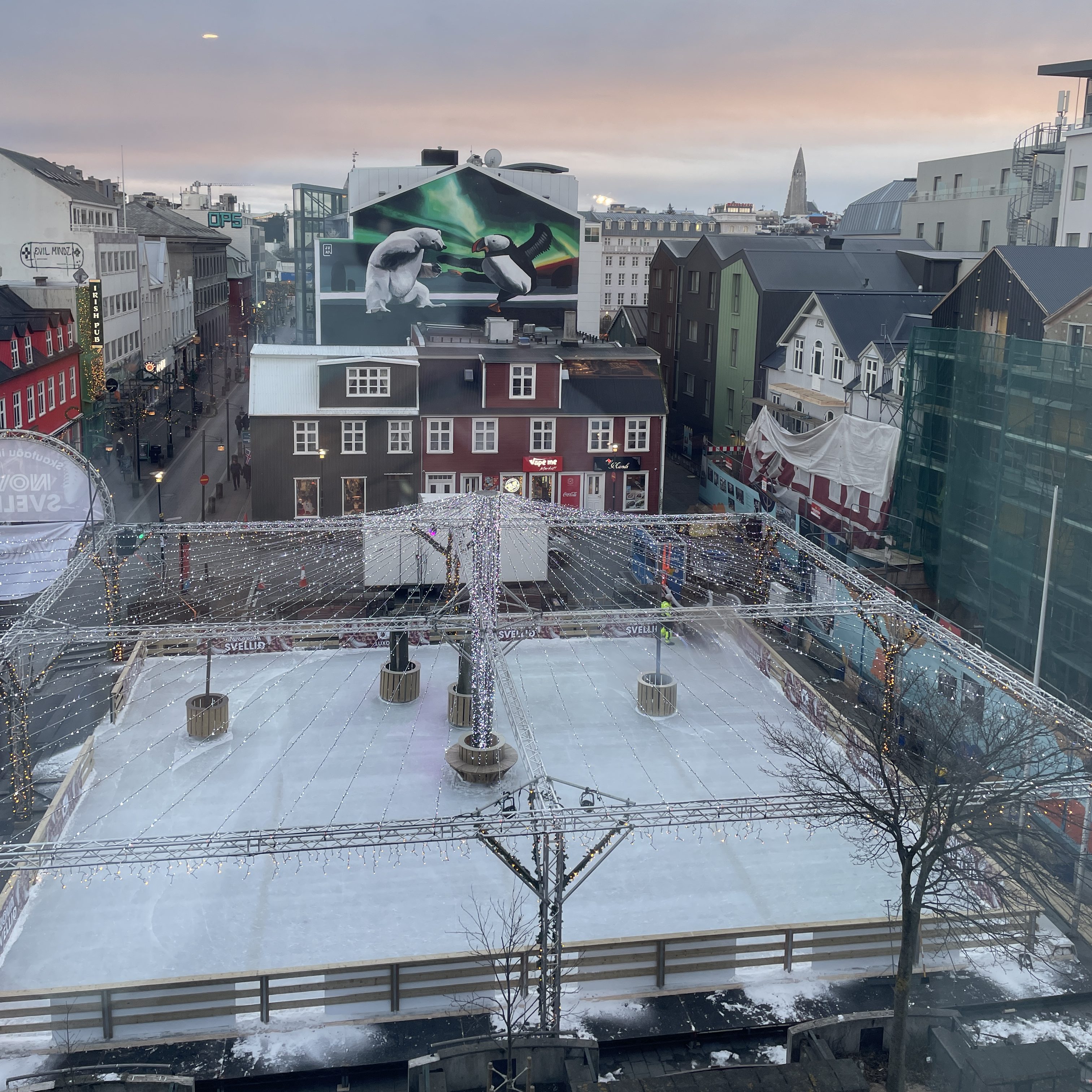 Themes seem to emerge with each travel experience–sometimes intentionally, sometimes serendipitously. Our recent trip to Reykjavik developed a literary theme, unexpectedly. Our original plan had been a one-day stop in the capital and then a few days in the north and then a day or two back in Reykjavik before returning to the US. Plans change, and we stayed in Reykjavik for the full week, our daughter and son-in-law joining with us for adventures new to them and to us. As we usually do, we stayed at Center Hotels Plaza, overlooking the square fitted out for ice skating.